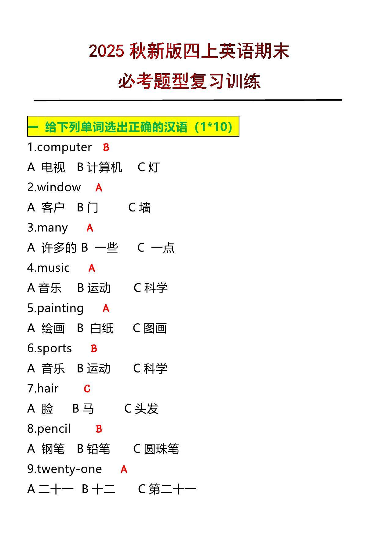 【2025秋新版】四年级上册英语必考题期末复习训练.pdf