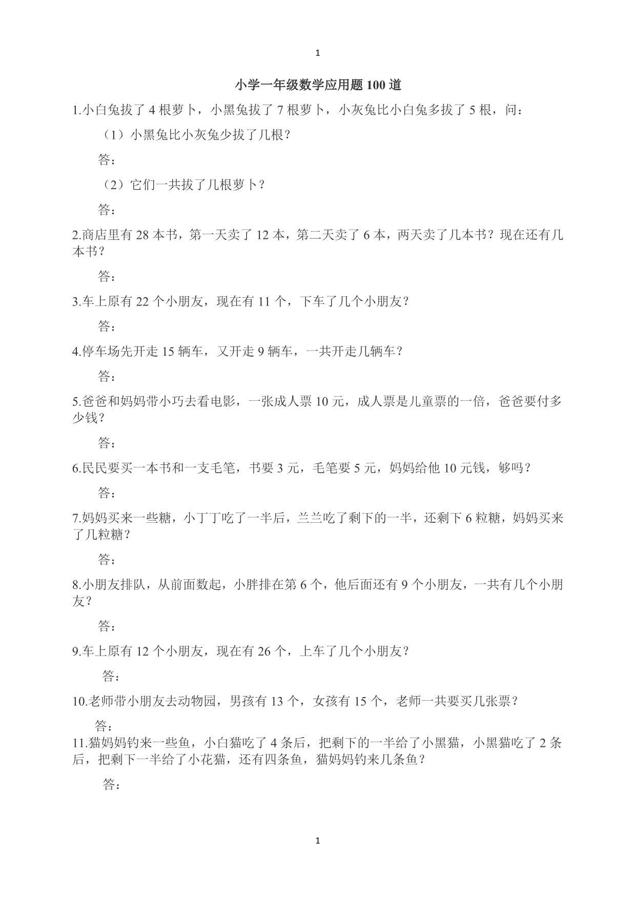 一(上)数学:必考应用题100道.pdf